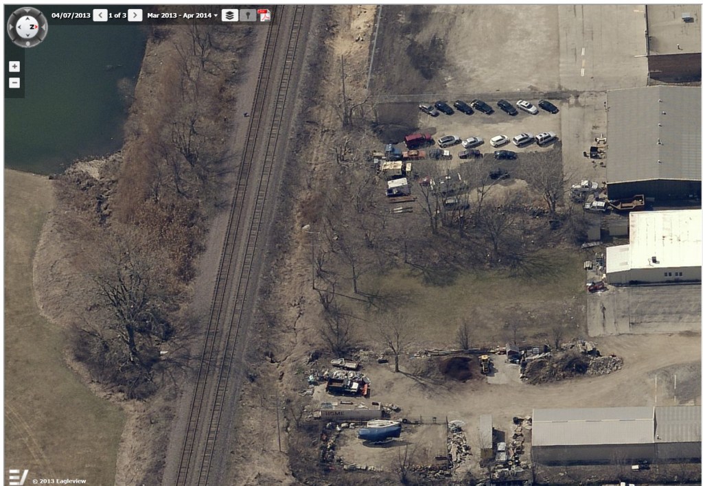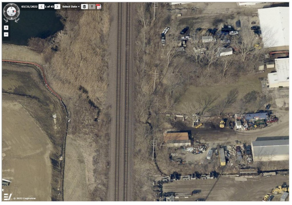 The left third of the above aerial photo taken March 21, 2022, is the northwest corner of Emma’s Landing. The right portion across the tracks is an industrial area in unincorporated Kane County. The “creek” along the tracks to the right drains to the south at a confluence through a large pipe and then directly into the Sterling Manor retention pond that abuts the Emma’s Landing site to the west. The tip of the pipe can just be seen to the left of the tracks. Precipitation falling on the gravel areas to the right is “undetained” according to a recent City of Geneva hydrological study. Thus, the only “management” of runoff is the limitation created by the pipe under the RR. Now, please note the dark brown/black staining in the permeable gravel areas that contain apparently non-operative vehicles and trailers. Particularly examine the large dark stain just adjacent to the creek confluence and the tire ruts leading toward, but not past, the confluence. Also, note that the gravel is stained by tire tracks leading away from the large black stain. Stains such as these suggest petroleum-based chemical leaking/dumping. Please examine this further yourself at: https://gistech.countyofkane.org/gisims/kanemap/getAddress_Pin_LatLng.asp?txtPin=1208224006The headwaters of Emma’s Creek“No Dumping” => See above image.This is what the headwaters of Emma’s Creek looked like in 2013. Please note the black splotches and plumes leading down toward the west branch to the confluence at the pipe. The Emma’s Landing site is an island, not a landing. The site is not walkable to basic goods and services, is surrounded by industrial brownfields, three railroad tracks soon to be even closer to buildings (noise, dust, and sub 2.5 diesel exhaust), retention plus detention ponds, and a wide vacant strip of land. This is “inclusion” under the “Geneva Way.”