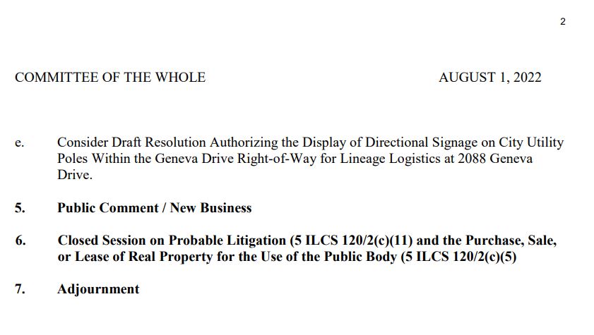 The City Council Committee of the Whole agenda for August 1, 2022, is published. While a noticeable improvement has occurred in the closed session citations of the specifically allowed exception in the Open Meetings Act, the August 1 agenda has the same stinker that was deployed during the Emma’s Landing debacle. Several OMA violations occurred during that process. But here is the Warning: The August 1 agenda cites an incorrect exception again because the word “sale” has been incorrectly inserted into 5 ILCS 120/2(c)(5). The sale of city-owned real property cannot be discussed in a secret session except for the specific purpose of setting the sale or lease price. In the Emma’s Landing sale of public property, many issues besides selling price were discussed secretly. Examples have been cited in other posts on this site. Please see “related” articles linked below for a sample.