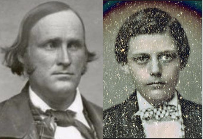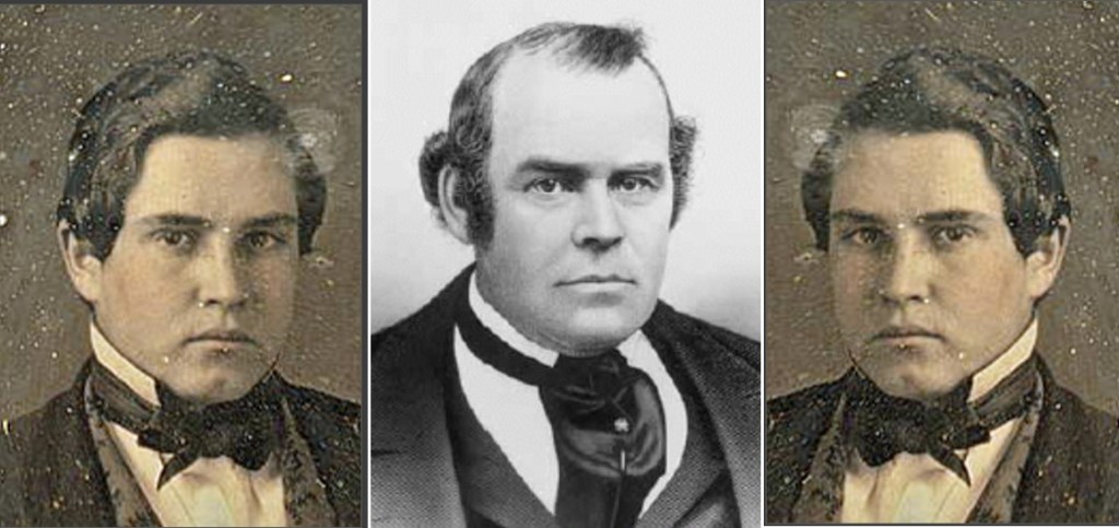 The two men depicted below are proposed by RBN to be Hyrum Smith (left) and Joseph Smith, Jr., (right). The portraits are from the Library of Congress Francis Henry Grice Daguerreotype Collection and are cropped from the originals and then horizontally flipped. The LOC Daguerreotype Collection introductory page is here: Daguerreotypes – About this Collection – Prints & Photographs Online Catalog (Library of Congress) (loc.gov). The banner atop this LOC introductory page depicts Reverend Augustus Conant and his wife Betsy Kelsy Conant as captured by F. Grice. Below is a link to their story and an explanation of their roles in formulating RBN’s proposed identities of the many men and women depicted by Francis Grice in this blog.