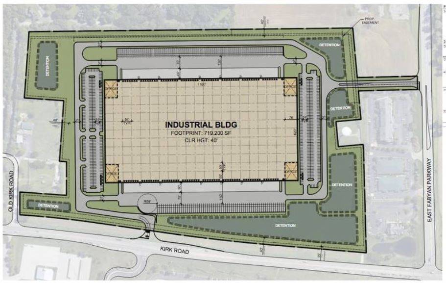 This 720,000 sq/ft warehouse is in the approval process by the Geneva City Council. This building will have 124 truck docks with access from Kirk Road and Fabyan Parkway.