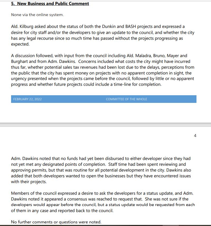Special Use Standard 8: “The proposed building, other structures and use comply with any and all regulations, conditions or requirements of the city applicable to such building, structure or use.” This standard adopts and mandates that ALL the provisions of the Municipal Code be met!!! No wiggle room existed until the current mayor took office decades ago. Now the City Council has completely destroyed the Special Use property value protections in Geneva and has infringed on a fundamental individual property right. Do not complain when the mayor approves a Tilted Kilt and massage parlor next to your house. (The Dunkin’ developer does these also.)