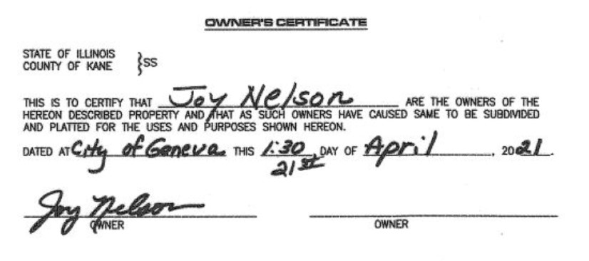 The Geneva City Council was inept or was duped if it did not know about the “stricken/replaced” document 2021K062993. The “stricken/replaced” document is not accompanied by an amendment to Geneva Ordinance 2021-03 that had been filed prior and includes the original Plat. The only valid Plat both when the Ordinance was passed and when it was officially recorded with the County was the one existing with Joy Nelson’s certification as the owner. If a Council member knew of the filing of the “correction” without a Council vote, that one member of the City Council is an accomplice to fraud. The title to real estate is not marketable if it includes the product of zoning fraud. Geneva taxpayers “enjoy” that liability.