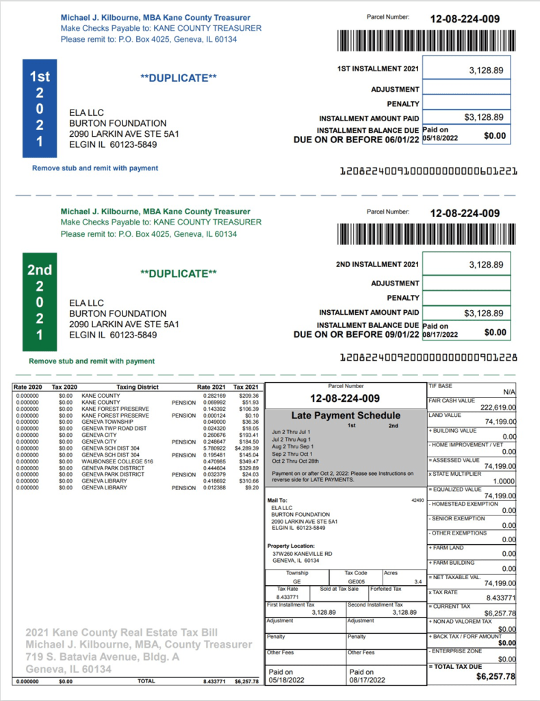 Then consider that Joy Nelson was the owner of parcel 12-08-224-00 that abuts the Emma’s PUD and provided the access from Lewis Road for the Emma’s PUD that was actually owned by the City of Geneva on April 21, 2021. Also consider that Joy Nelson sold that abutting parcel to James Bergman on June 29, 2021 for $650,000. Mr. Bergman’s address on the deed is given as 2090 Larkin Ave, Suite 5A-1, Elgin. This happens to be the address of the Burton Foundation that is now listed on the tax bill as the owner of the former Joy Nelson property.